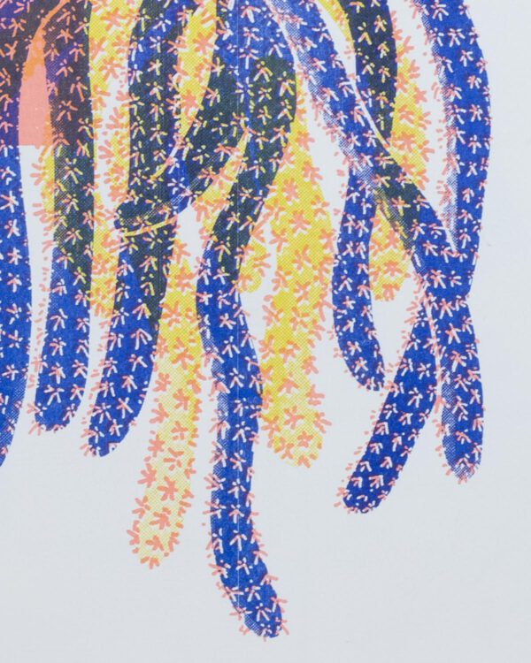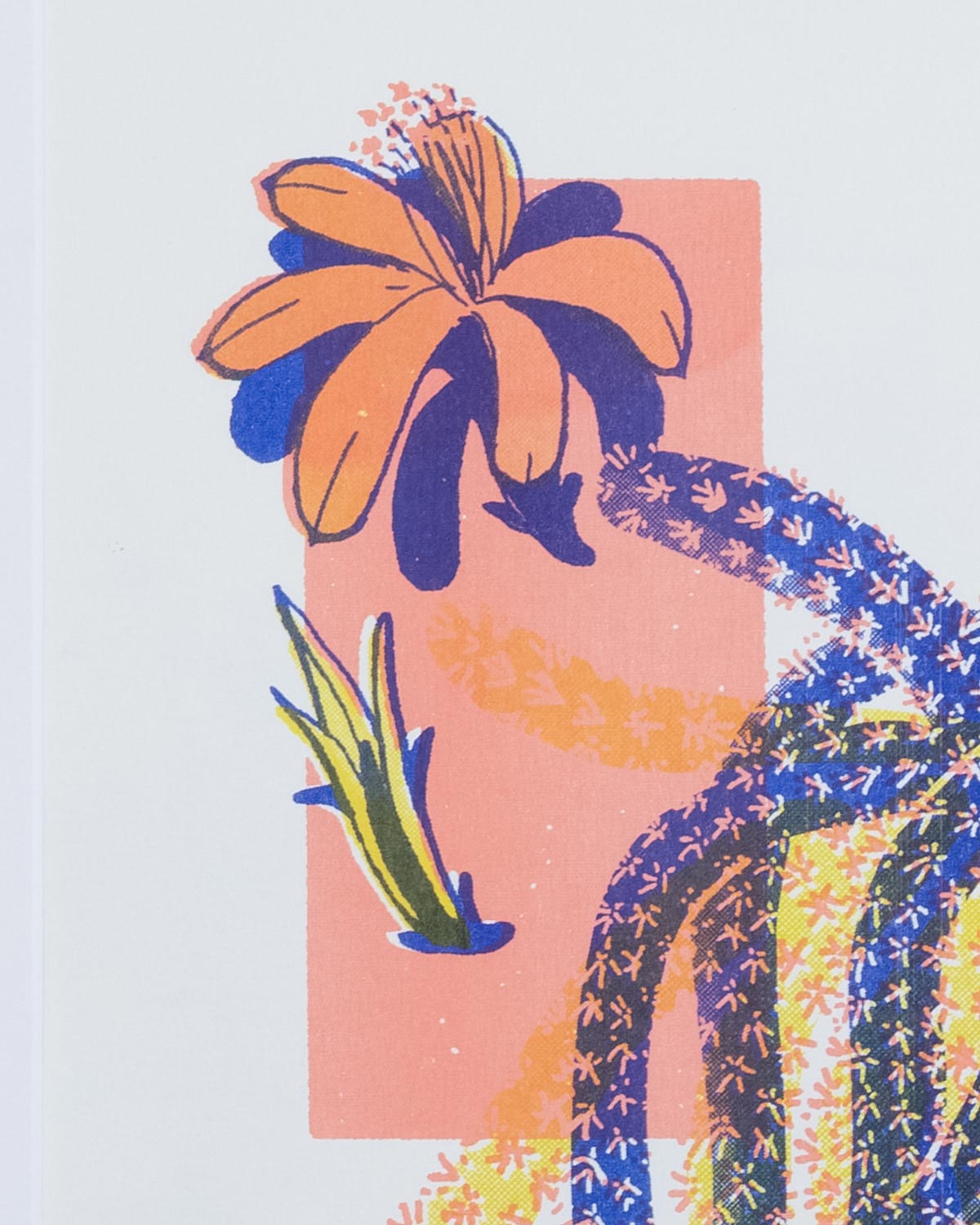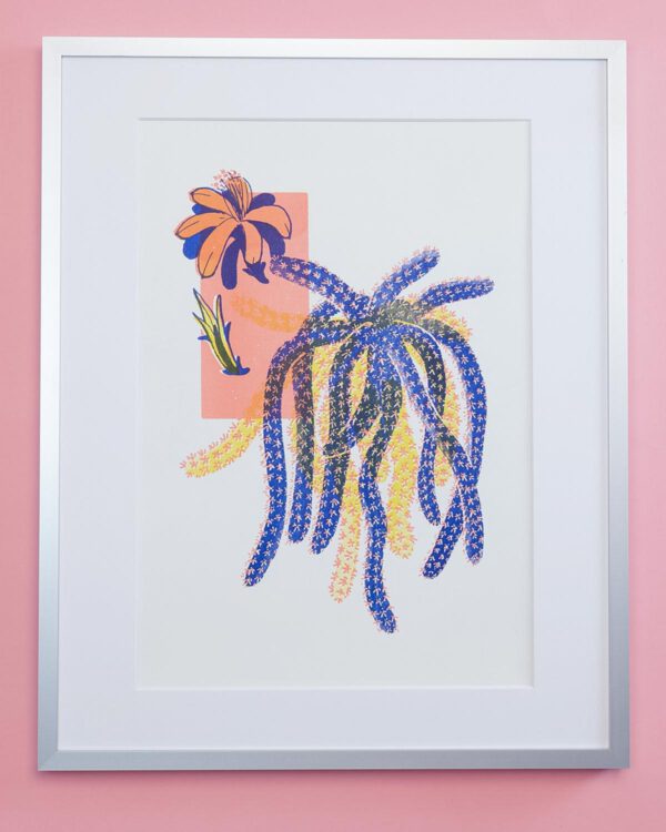 Liebe voll auch „Rattenschwanz“ genannt, braucht dieser Kaktus viel Licht, wenig Wasser, und blüht wunderschön in knalligem Lila. Riso-gedruckt schmückt er dein Wohnzimmer mit marineblau, pfirsichbeige und gelb – ganz pflegeleicht.